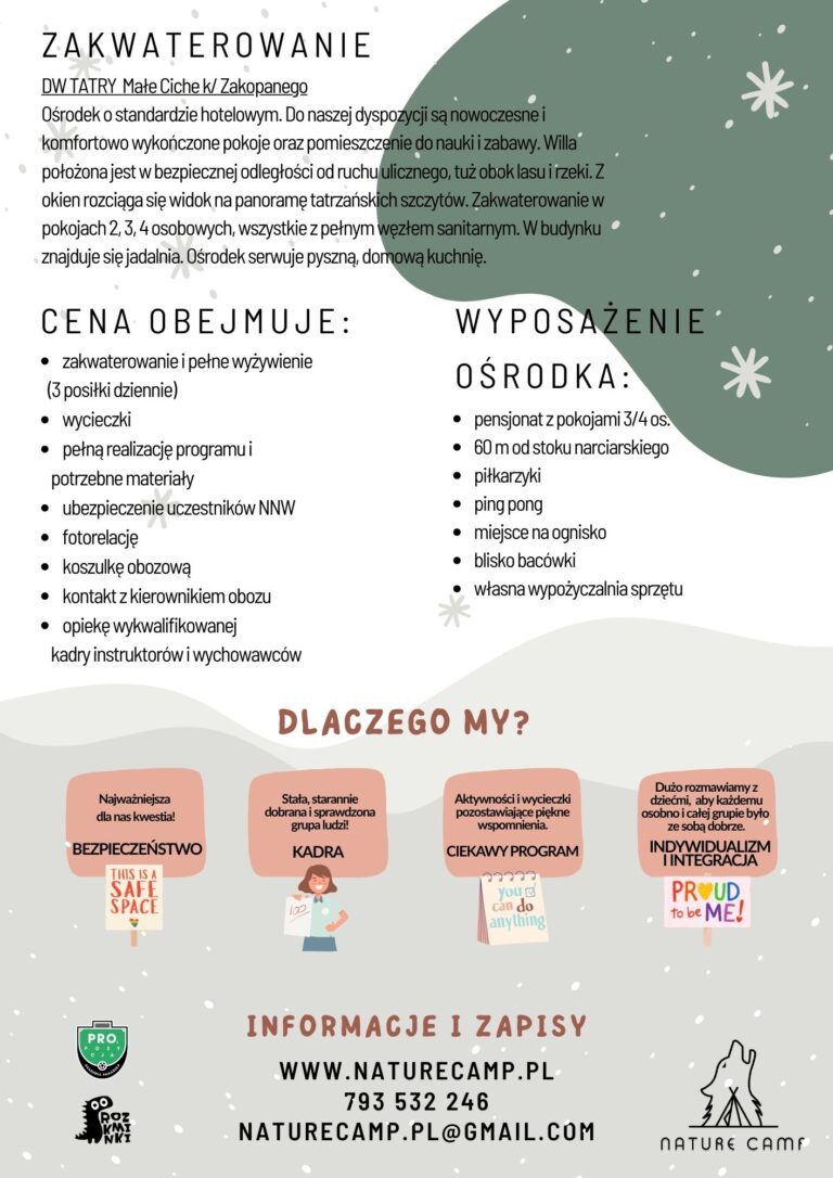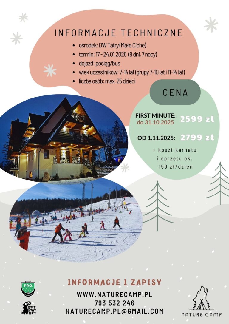 MAŁE CICHE (17.01.2026 - 24.01.2026) Dlaczego obóz z Nature Camp? - zabawa i przygoda w otoczeniu natury - integracja, relacje, przyjaźnie - bogaty, różnorodny program - empatyczna, doświadczona kadra - bezpieczeństwo
